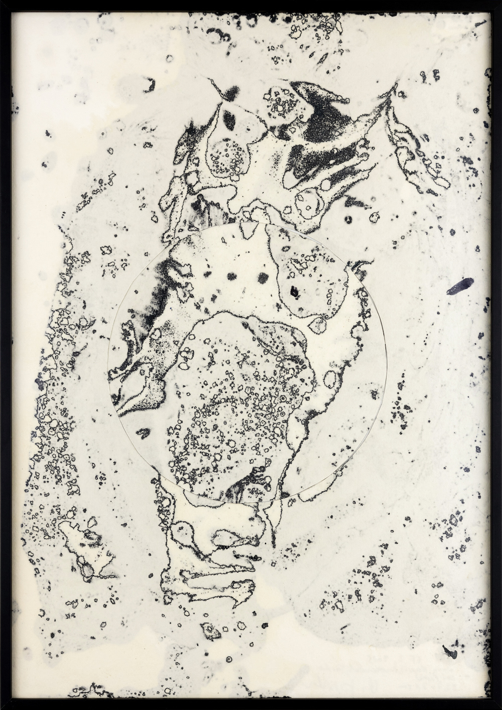 Essential fluids: Placental blood, resin, honey, water, breast milk, ocean salt water, sepia ink... What nourishes us? At birth, we are directly dependent on nourishing fluids in direct form (mother's milk) and in indirect form (from intact, nourished and connected ecosystems).the collected "essential fluids" come from nature and from humans and animals. As a heterogeneous mixture, they only partially combine and only develop their structures on the subsurface. The structures can only be roughly preserved; their components (the organic liquids) continue to change slowly with time and incident sunlight. In various series, different formulations of these liquids are tested, microscoped and collected on microscope slides. The focus is on the various properties, such as feeding, growing or healing wounds. Fragments of different ecosystems and habitats in the sea, inland waters and on land are combined with each other.